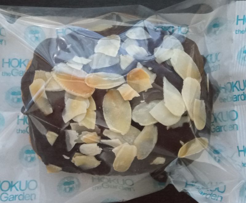 チョコをかけたクロワッサン生地の中にチョコが仕込んであり、アーモンドが散りばめられている。