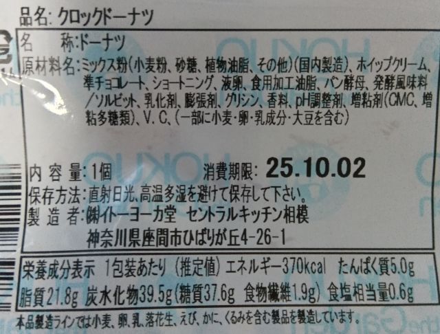 ドーナツ生地にホイップクリームが挟まれており、チョコがかけてある。美味しい。
