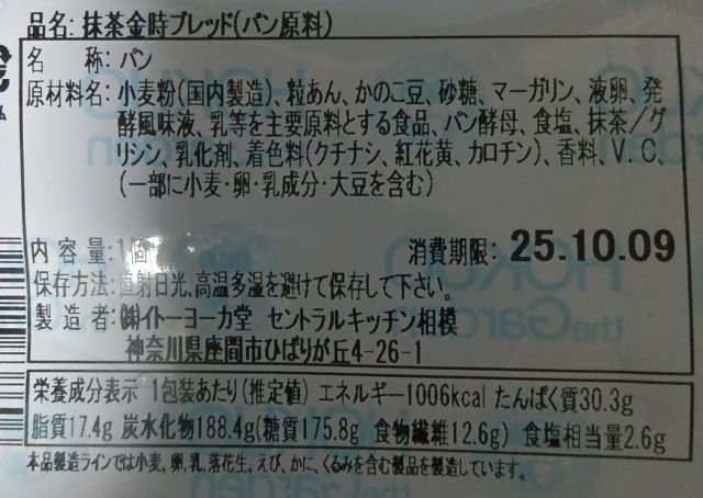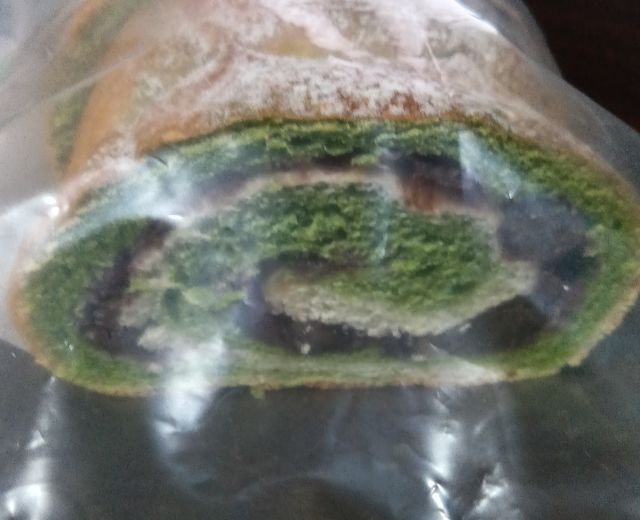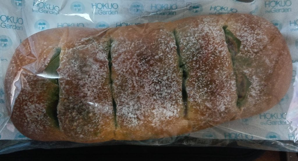 でかい。抹茶を練り込んだパン生地であんこを巻いている。断面の白はクリームとかではなくパン生地。抹茶風味は控えめ。右端1/4、左端1/4 はほぼあんこは入っておらず、抹茶生地も少ない。
